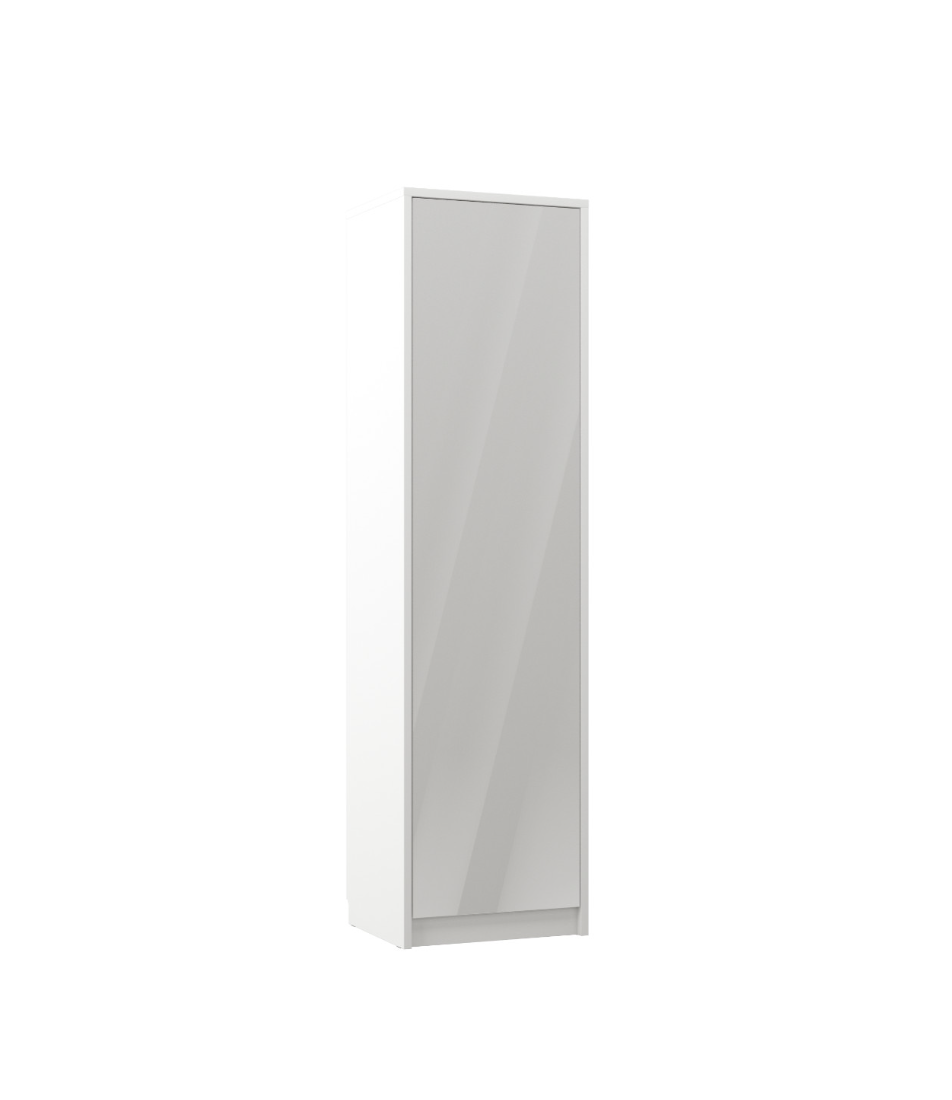 Funkcionali, vietą taupanti spinta su dviem kabinimo strypais drabužiams ir viršutine lentyna sulankstytiems drabužiams ar aksesuarams. Korpusas – matinės baltos spalvos, fasadai – blizgios baltos. Puikiai dera prie vertikalios GS sulankstomos lovos „White Gloss“ spalvos.