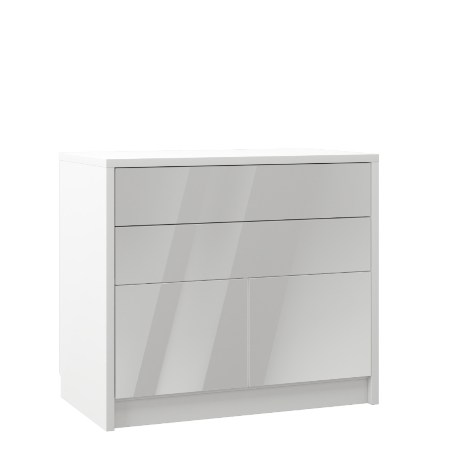 Patogi ir talpi komoda su dvejomis durelėmis ir dviem stalčiais, idealiai tinkanti drabužiams ar kasdieniams daiktams laikyti. Korpusas iš baltos matinės plokštės, o fasadai – baltos blizgios apdailos. Puikiai dera su GS Murphy lova baltos blizgios spalvos.
