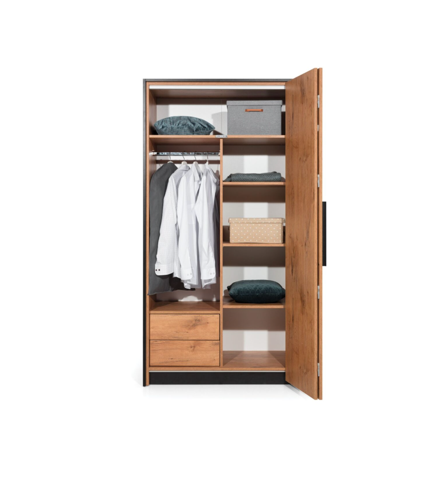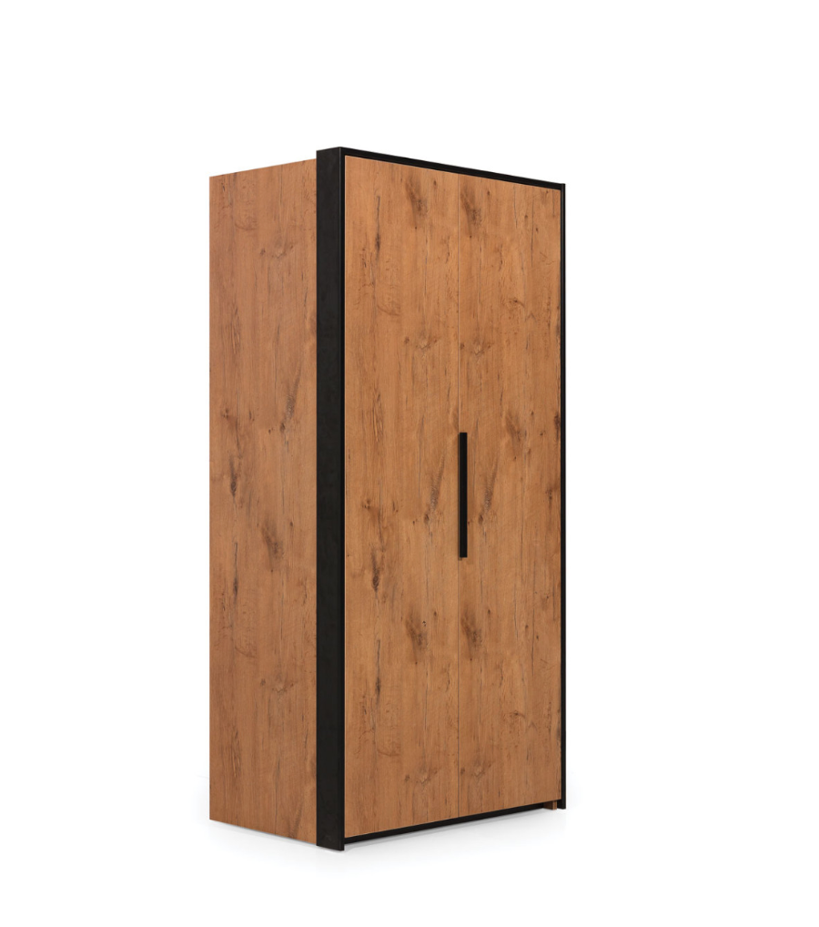 Išskirtinio dizaino dviejų durų spinta, pagaminta iš baldų plokštės su Lancelot ąžuolo apdaila. Durys atsidaro armonikos principu, o ilgos juodos medinės rankenos puikiai dera su juodu apvadu, einančiu aplink visą spintą, pabrėždamos jos industrinį lofto stilių.