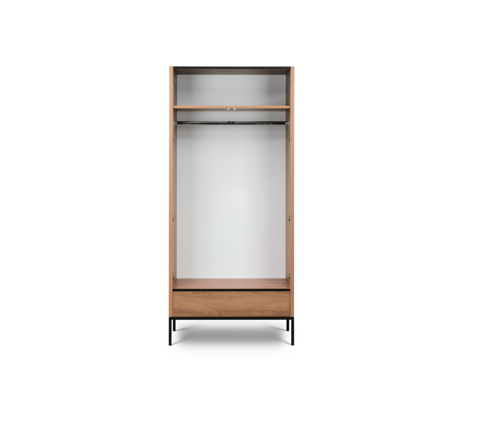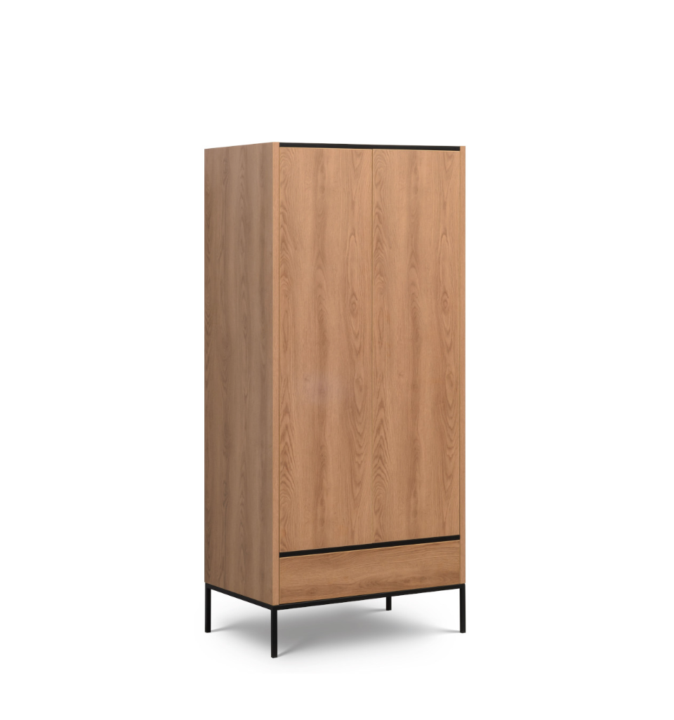 Pagaminta iš itin kokybiškos, malonios liesti matinės baldų plokštės medaus ąžuolo spalvos, su aiškiai matoma medienos rašto struktūra, puikiai imituojančia natūralų medį. Juodas metalinis rėmas, pereinantis į kojeles, dera su dviem horizontaliomis juodomis linijomis, kurios skiria stalčius nuo durų ir puošia viršutinį spintos skydą. Viduje – kabykla ir plati lentyna, užtikrinančios praktišką drabužių laikymą.