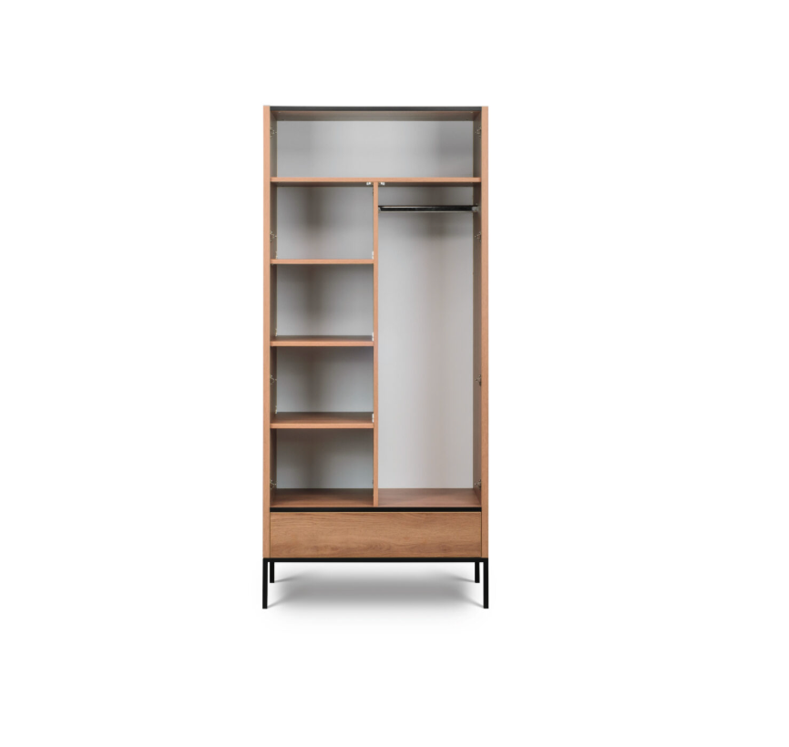 Pagaminta iš itin kokybiškos, malonios liesti matinės baldų plokštės medaus ąžuolo spalvos, su aiškiai matoma medienos rašto struktūra, puikiai imituojančia natūralų medį. Juodas metalinis rėmas, pereinantis į kojeles, dera su dviem horizontaliomis juodomis linijomis, kurios skiria stalčius nuo durų ir puošia viršutinį spintos skydą. Viduje – kabykla ir kelios praktiškos lentynos, užtikrinančios funkcionalų ir patogų drabužių bei daiktų laikymą.