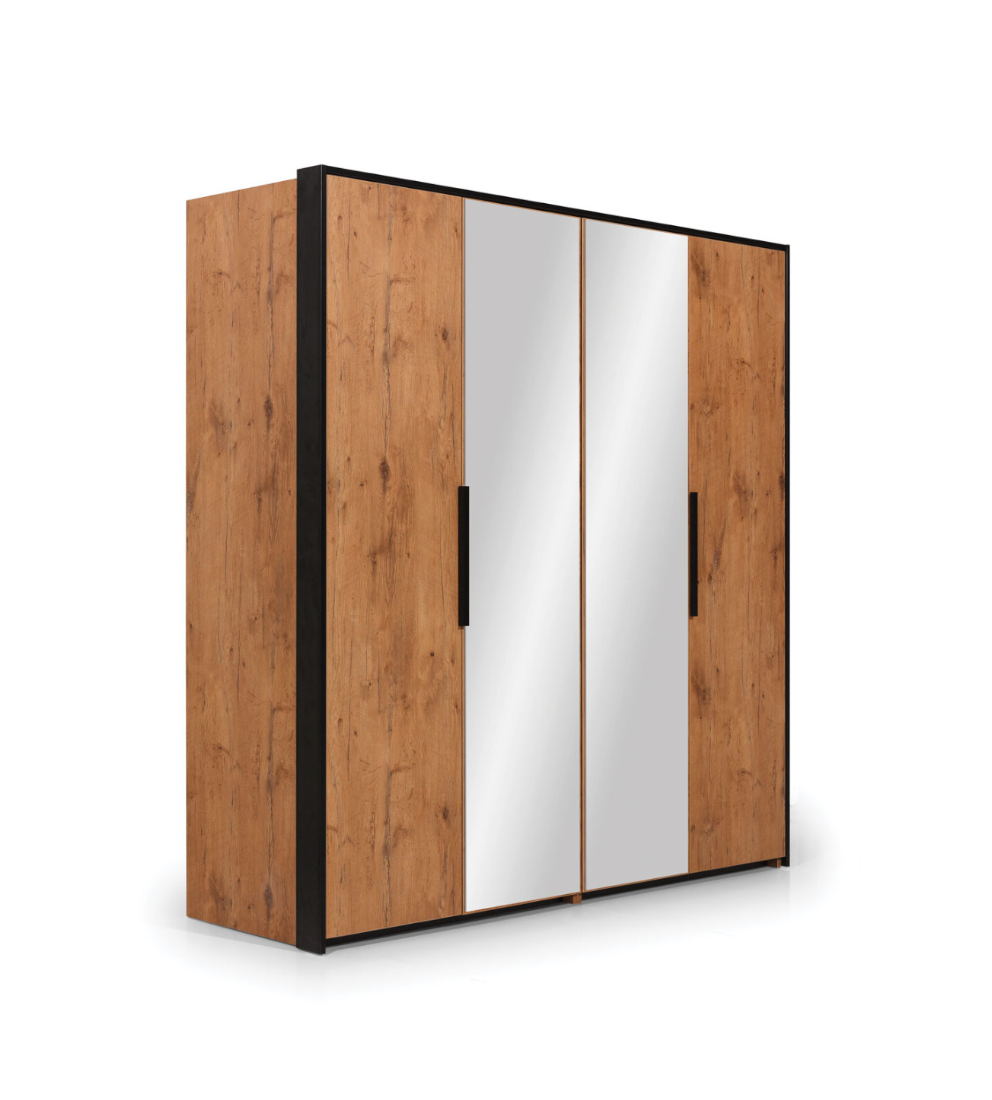 Erdvi ir stilinga keturių durų spinta, pagaminta iš aukštos kokybės baldų plokštės šilto Lancelot ąžuolo apdailos. Durys atsidaro armonikos principu, o vidinėje dviejų centrinių durų pusėje įmontuoti dideli veidrodžiai. Patogios ilgos juodos medinės rankenos dera su juodu apvadu, einančiu aplink visą spintą, suteikdamos baldui išskirtinį lofto charakterį.