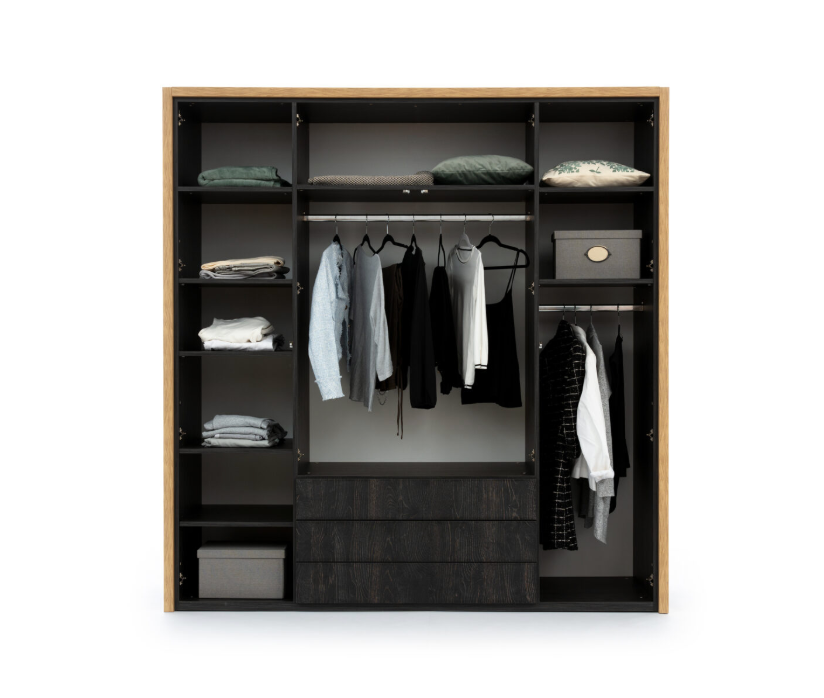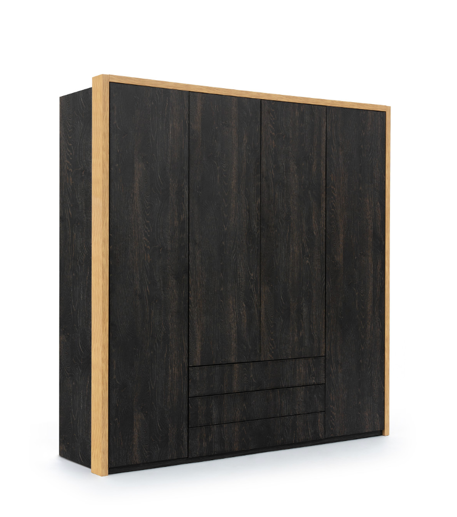 Itin talpi ir patogi keturių durų spinta, pagaminta iš Flamed Wood baldų plokštės su subtiliomis medaus spalvos gyslomis juodame fone ir kilnios alyvuoto ąžuolo atspalvio plokštės. Viduje įrengti praktiški sprendimai patogiam daiktų laikymui. Durys atsidaro naudojant „push & pull“ sistemą, užtikrinančią elegantišką ir minimalistinį dizainą.