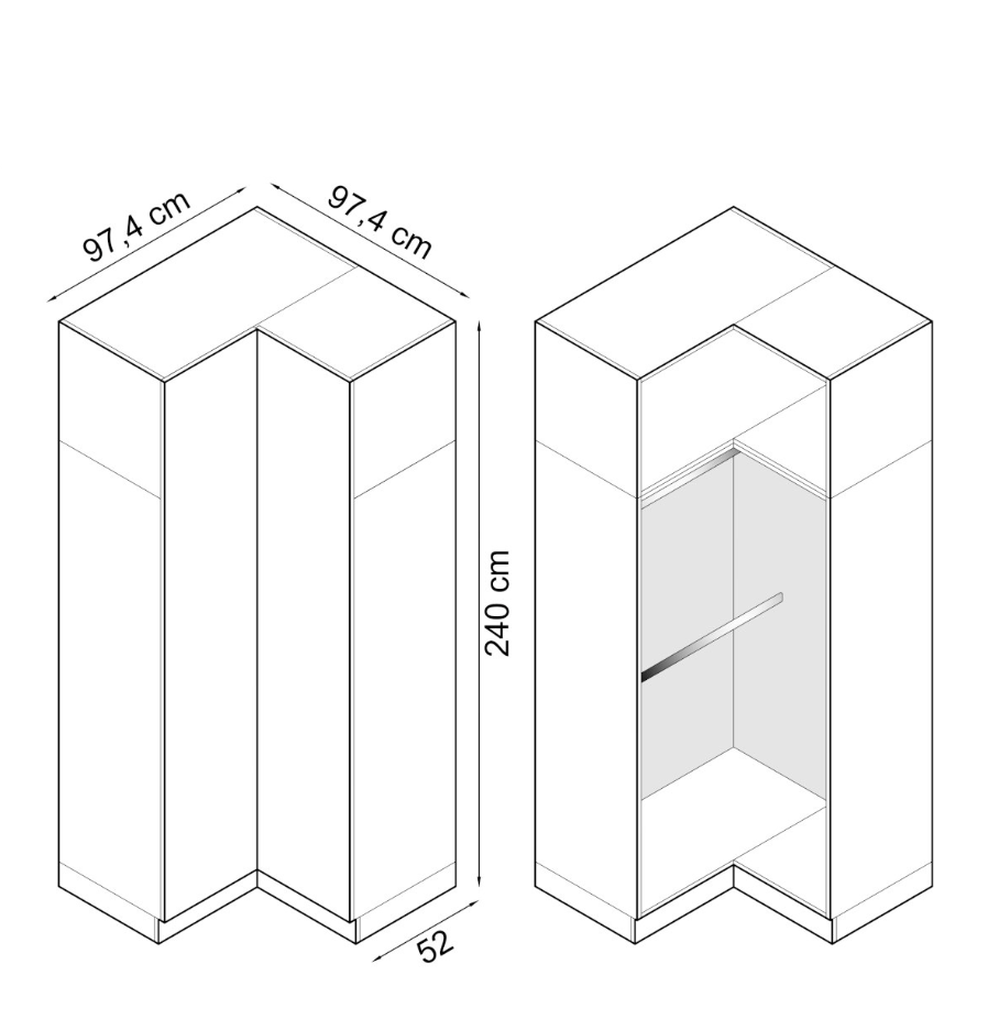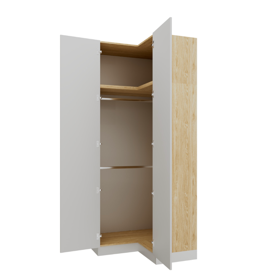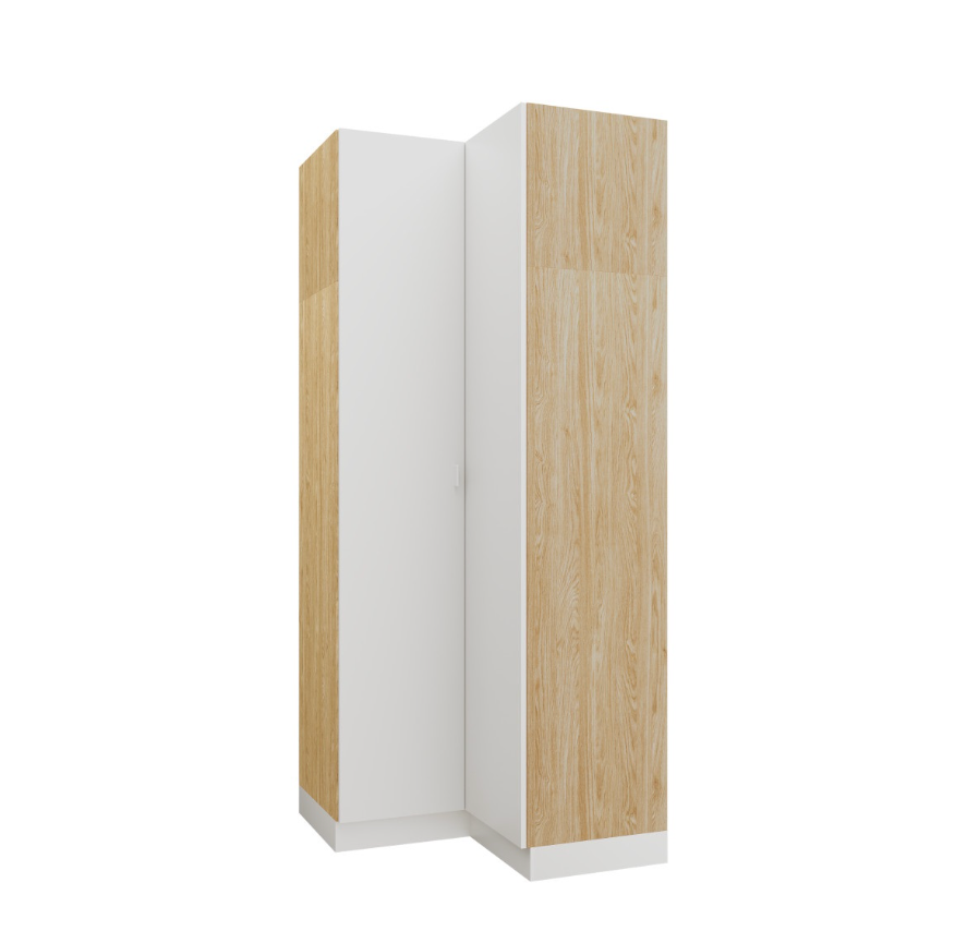 Labai talpi ir patogi spinta su kabykla ir lentynomis drabužiams (plotis – 90 cm). Korpusas pagamintas iš melaminu dengtos plokštės alyvuoto ąžuolo spalvos, o fasadai – iš baldų plokštės blizgios baltos spalvos.