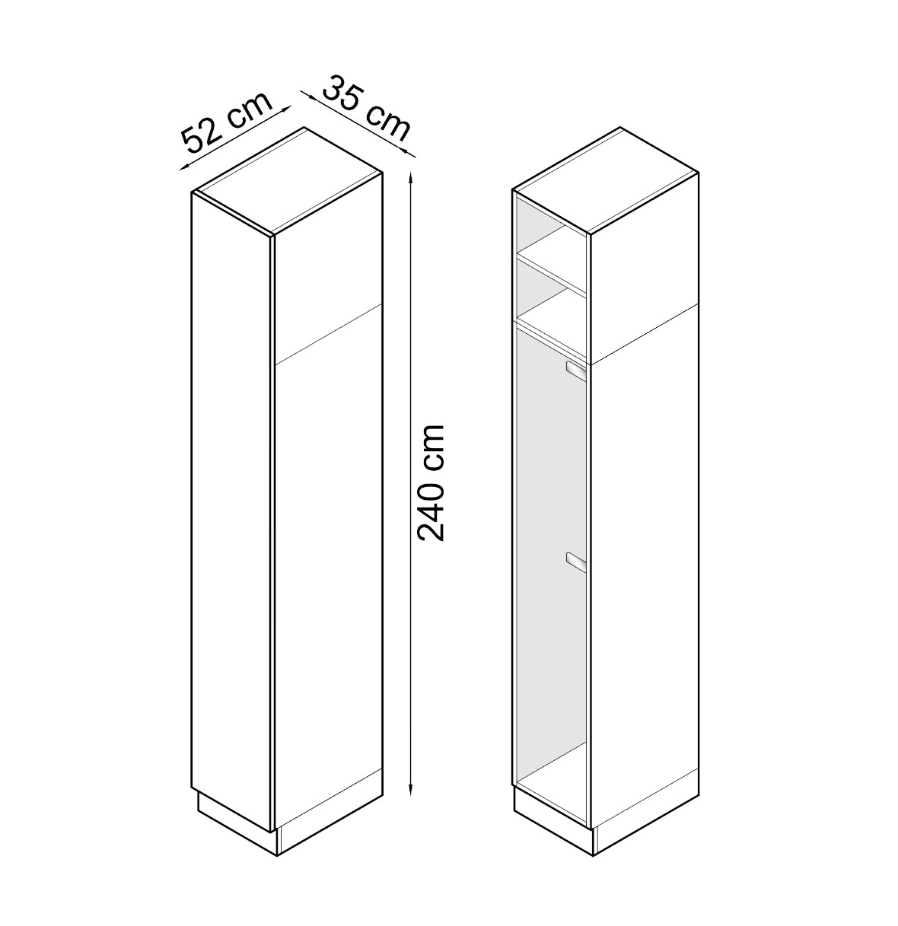 Siaura spinta su kabykla ir lentynomis drabužiams (plotis – 35 cm). Korpusas pagamintas iš laminuotos baldų plokštės alyvuoto ąžuolo apdailos, o fasadai – iš baltos blizgios laminuotos plokštės. Puikiai papildo esamą miegamojo baldų komplektą.