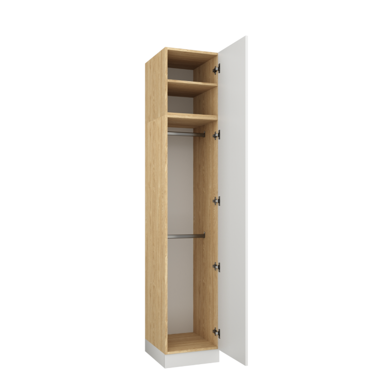 Kompaktiška, tačiau talpi spinta su kabykla ir lentynomis drabužiams (plotis – 45 cm). Korpusas ir fasadai pagaminti iš patvarios laminuotos plokštės, padengtos elegantiška alyvuoto ąžuolo apdaila. Puikiai tinka tiek kaip atskiras baldas, tiek kaip dalis didesnės modulinės sistemos.