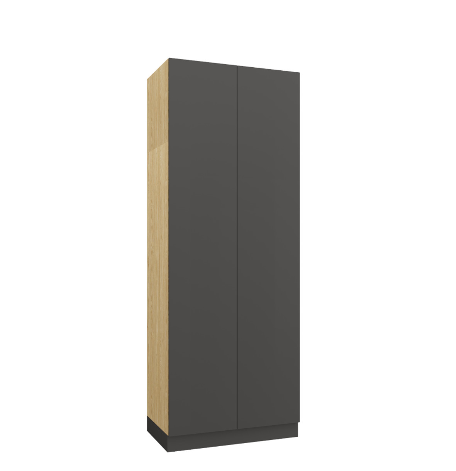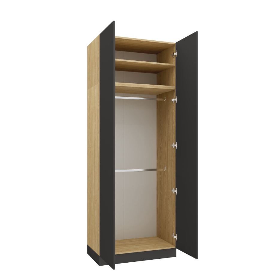 Labai erdvi ir funkcionali spinta su kabykla ir lentynomis drabužiams (plotis – 90 cm). Korpusas ir lentynos pagaminti iš baldų plokštės alyvuoto ąžuolo apdailos, o durelės – modernios grafito spalvos.