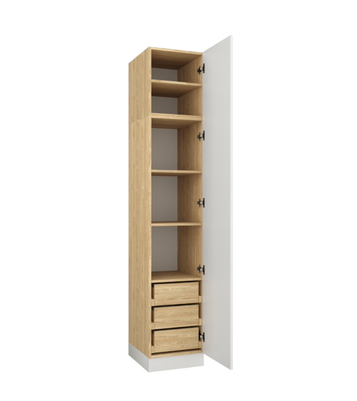 Erdvi ir praktiška spinta su vidiniais stalčiais ir lentynomis drabužiams (plotis – 45 cm). Korpusas ir fasadai pagaminti iš laminuotos plokštės, padengtos elegantiška alyvuoto ąžuolo apdaila, derinančia patvarumą ir modernų stilių.