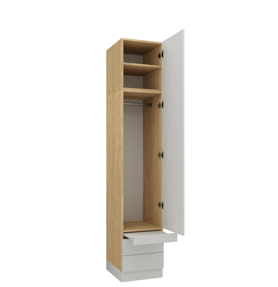 Talpi ir patogi spinta su vidiniais stalčiais ir lentynomis drabužiams (plotis – 45 cm). Korpusas pagamintas iš melaminu dengtos plokštės alyvuoto ąžuolo spalvos, o fasadai – iš baldų plokštės matinės baltos spalvos.