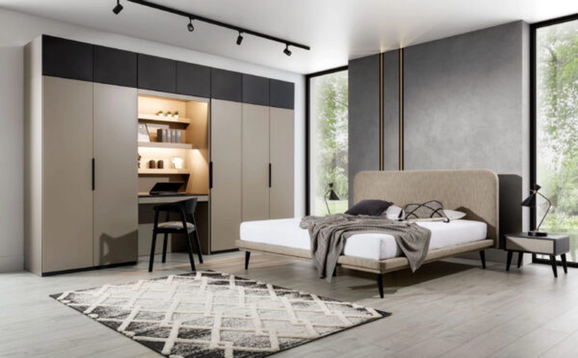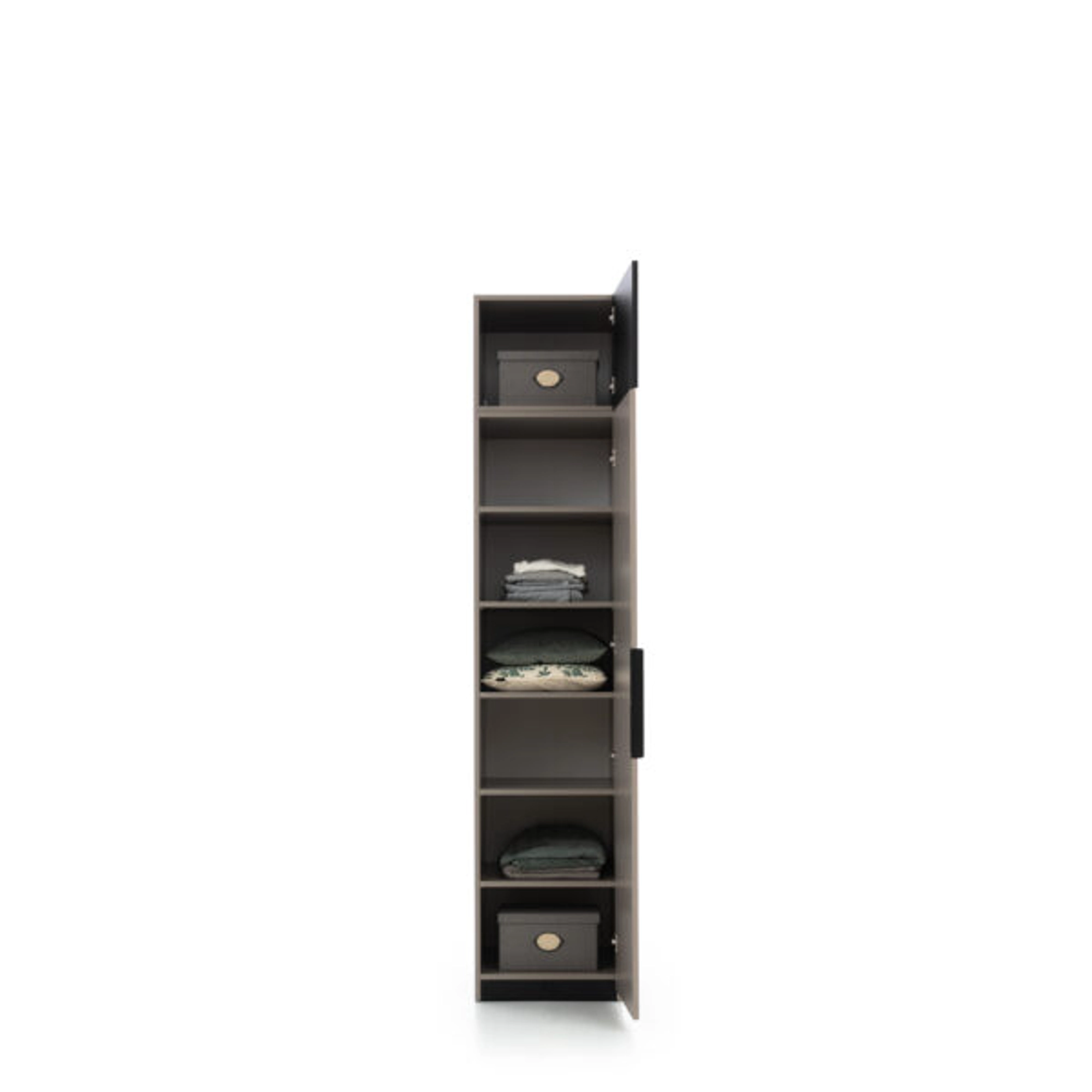 Praktiška viendurė spinta iš Ufficio sistemos su lentynomis. Pagaminta iš pilkai smėlio spalvos Kongo spalvos baldų lentos.